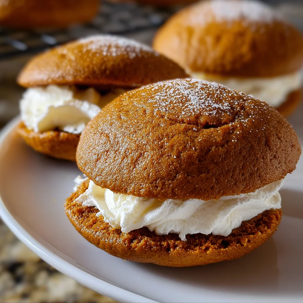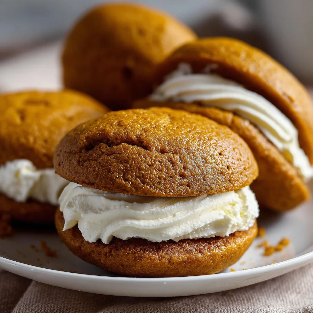 Pumpkin Whoopie Pies are delightful cookies filled with a creamy frosting, perfect for fall.