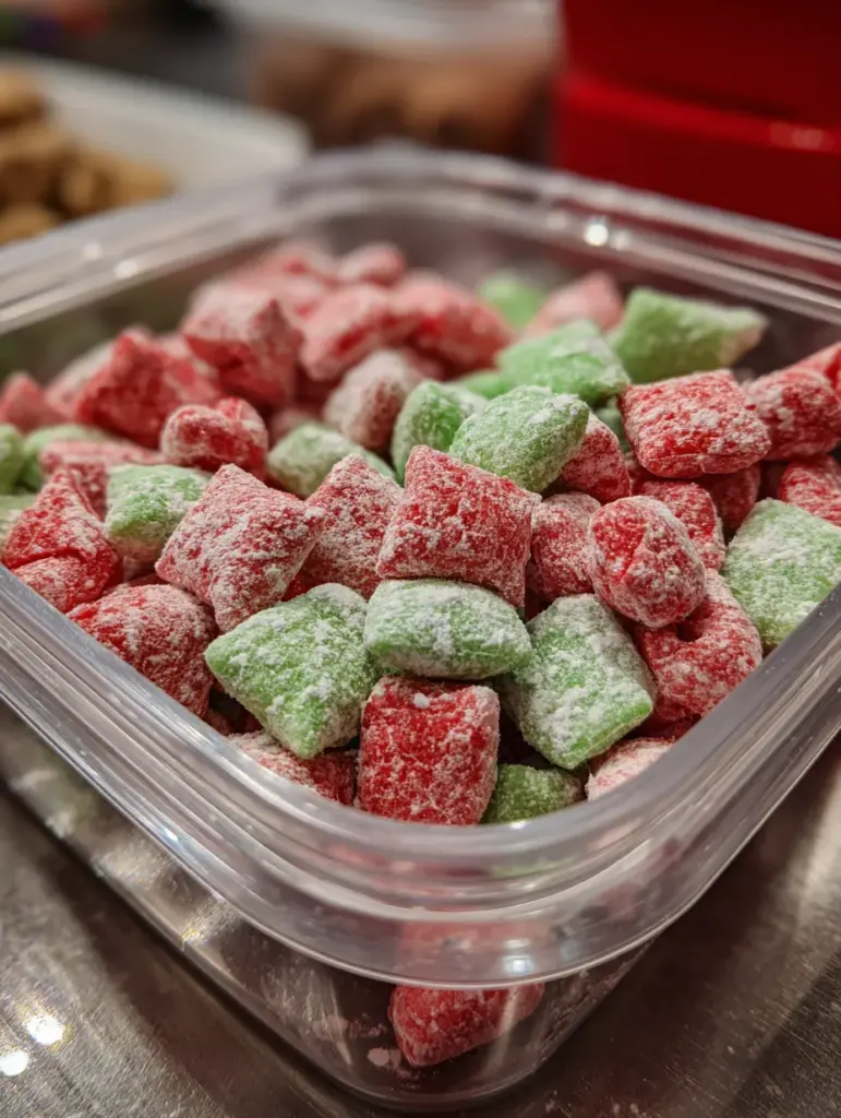This festive version uses red and green candy melts to create those bright, holiday-perfect colors you see in the bowl. Tossed with powdered sugar to mimic snow and layered in with white chocolate for an optional third batch, this treat becomes a visual (and edible) Christmas masterpiece. It’s simple, colorful, and perfect for all ages.