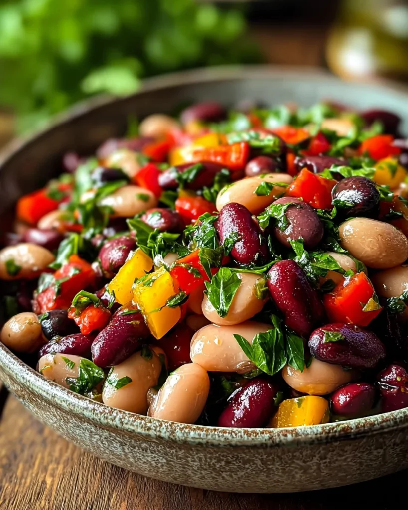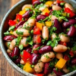 A colorful and healthy delight that combines various beans and fresh vegetables for a nutritious salad.