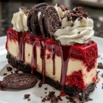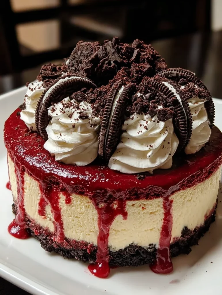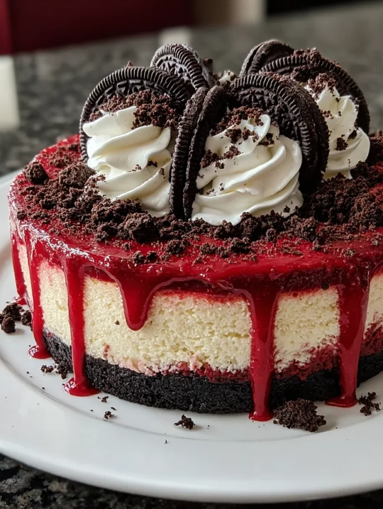 A rich and creamy Red Velvet Oreo Cheesecake with a crunchy Oreo crust and delightful toppings.