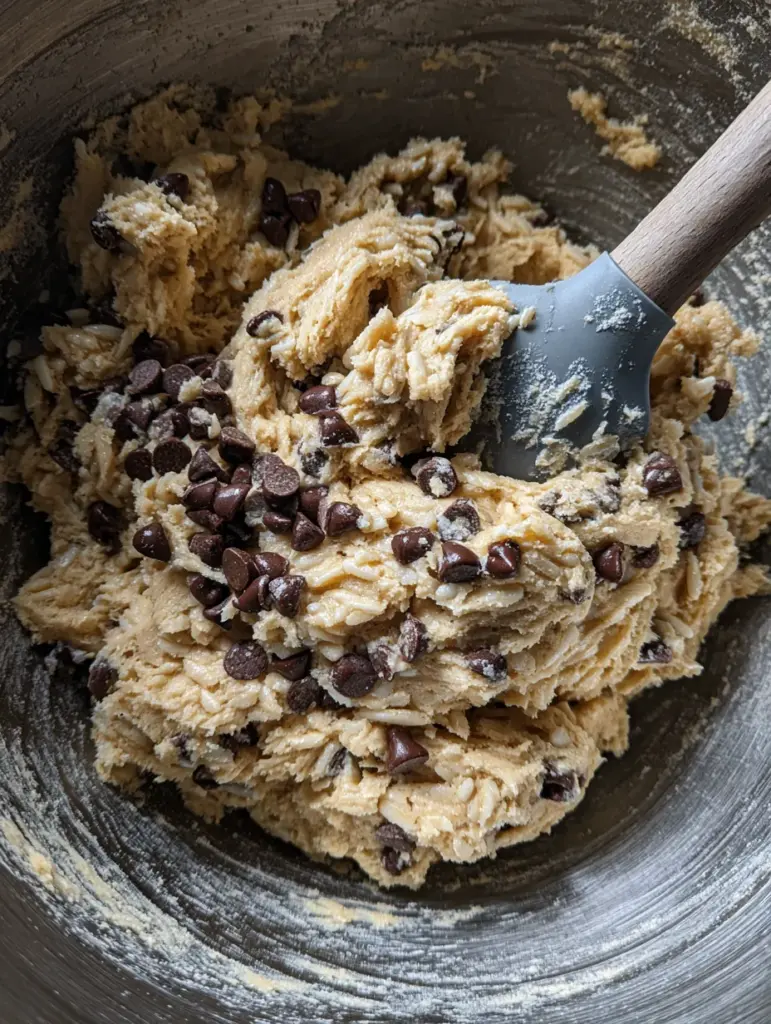 Fold in Rice Krispies and mini chocolate chips carefully. The dough should be thick, textured, and slightly sticky.