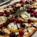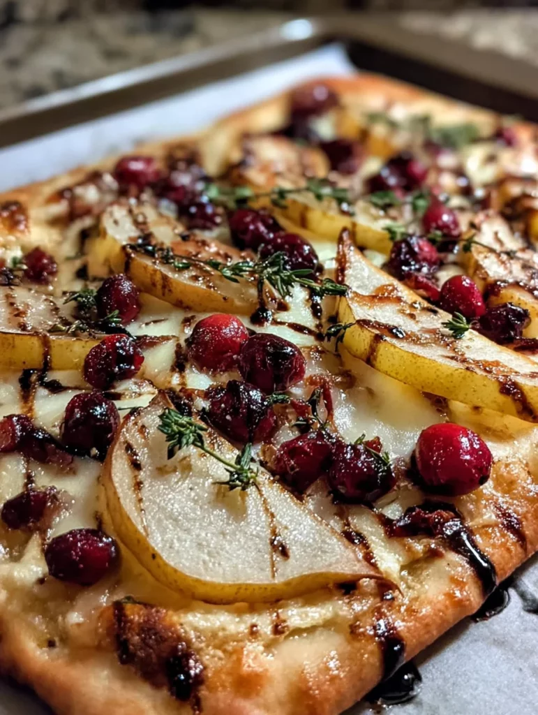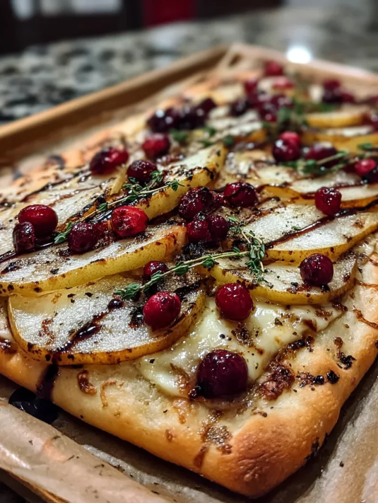 A delicious roasted pear, cranberry, and brie flatbread, perfect for a festive appetizer or a savory snack.