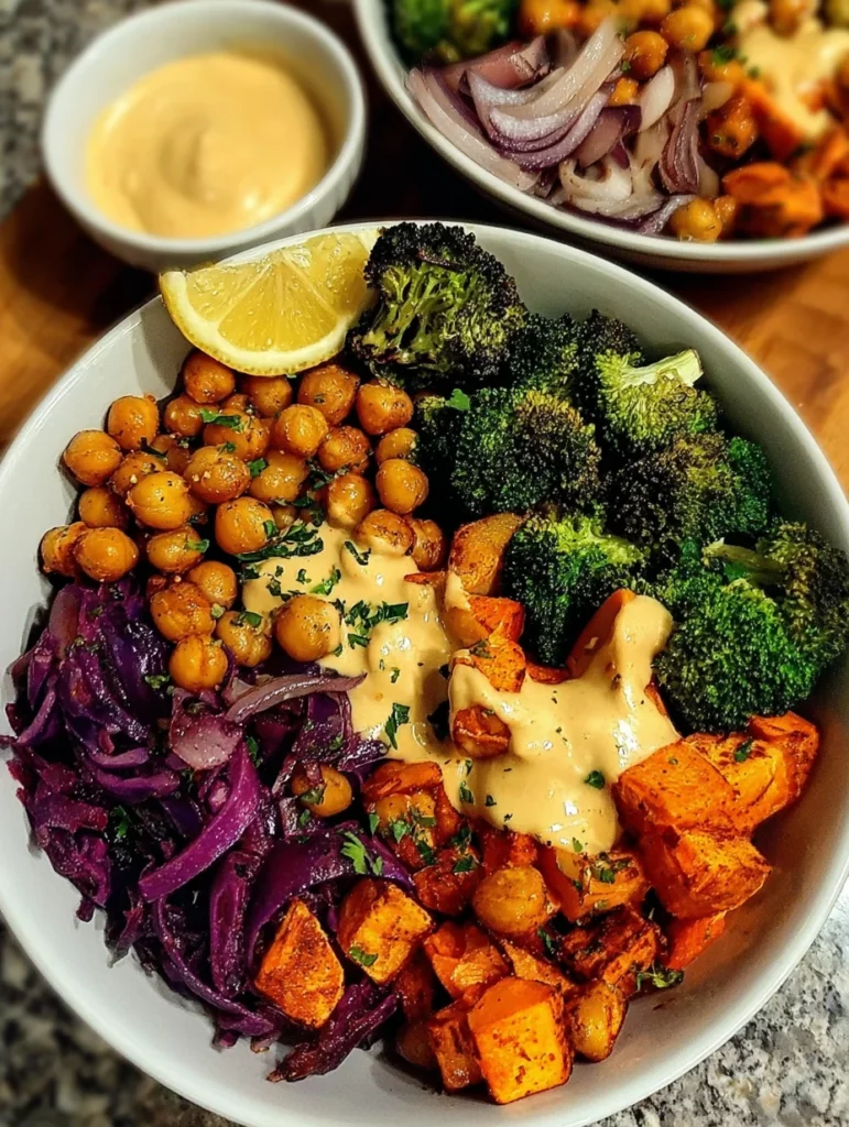 - Assemble bowls: layer grains (if using), then roasted vegetables and chickpeas.