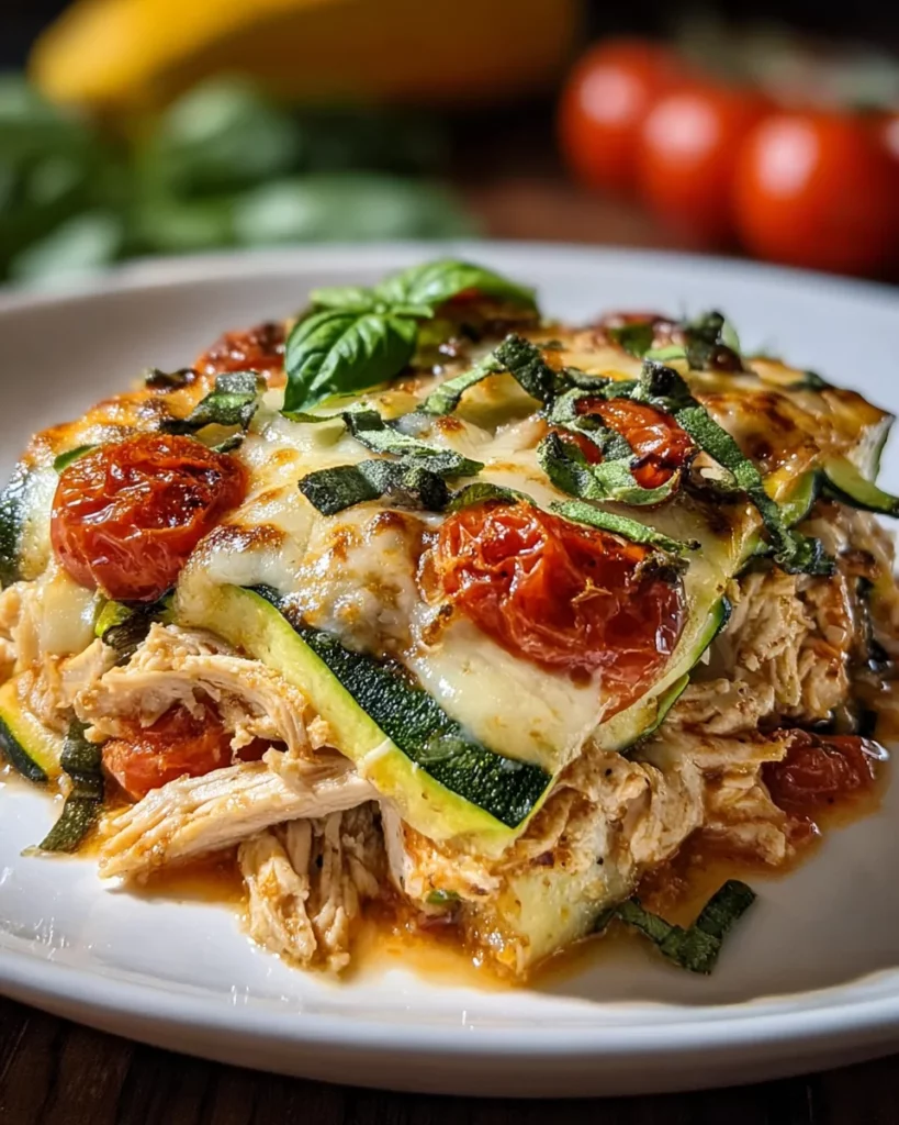 A flavorful casserole combining shredded rotisserie chicken and fresh zucchini, topped with melted cheese.