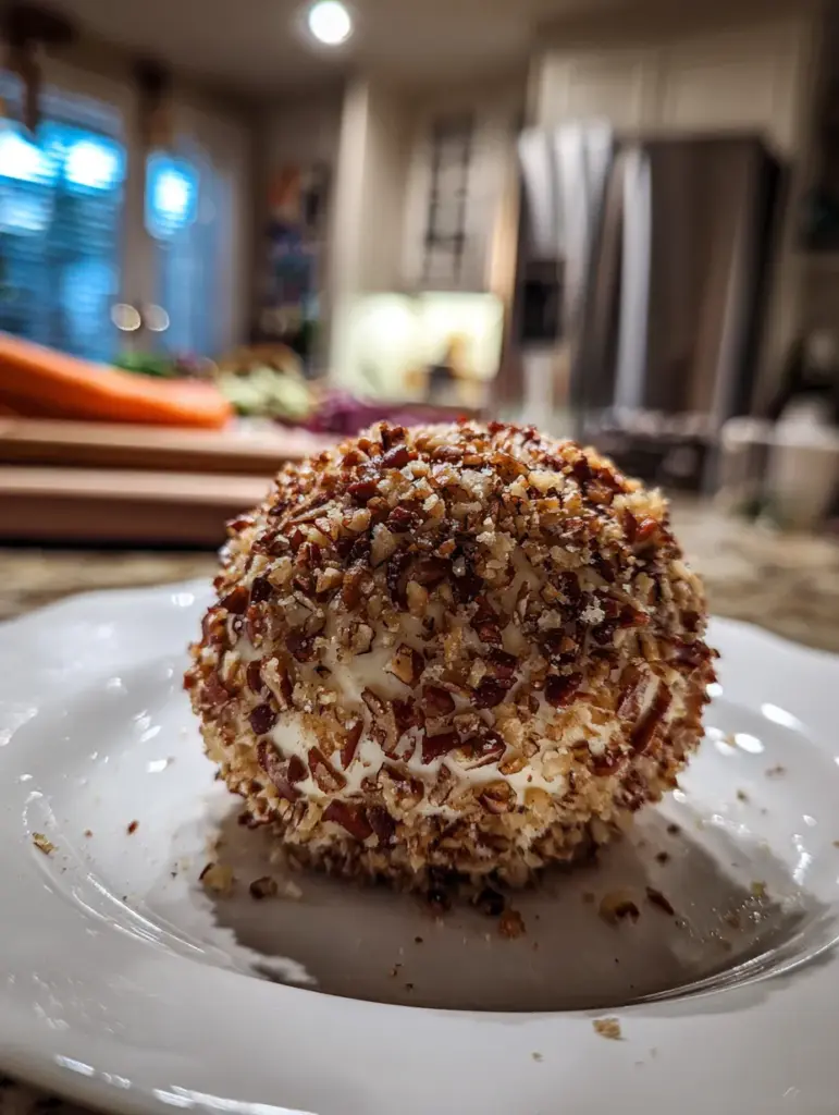 Place the coated cheese ball on a serving plate and pop it in the fridge for 30 to 45 minutes. This helps it firm up and hold shape—especially important if you’re planning to travel with it or serve it later.