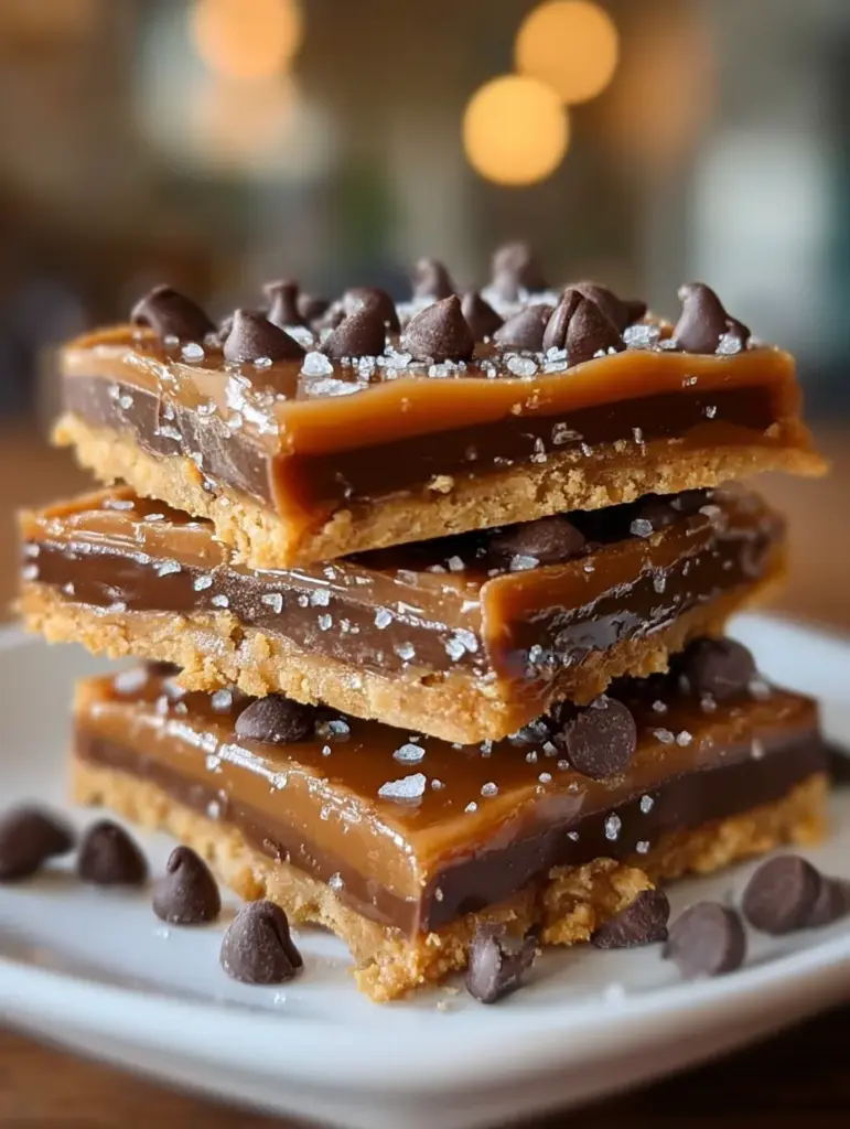 A golden-baked saltine base, rich melted chocolate, thick glossy caramel poured over top, and a dusting of mini chocolate chips and flaky sea salt… all stacked in perfectly layered squares. They’re ridiculously easy to make but taste like you spent hours crafting them. Let’s get you hooked.