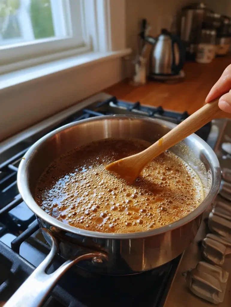 In a saucepan, melt butter. Add brown sugar, corn syrup, and salt. Bring to a boil and let it bubble for 3 minutes without stirring. Remove from heat and stir in vanilla. The caramel should be glossy and thick. (≈ 8 minutes) 🍯🔥