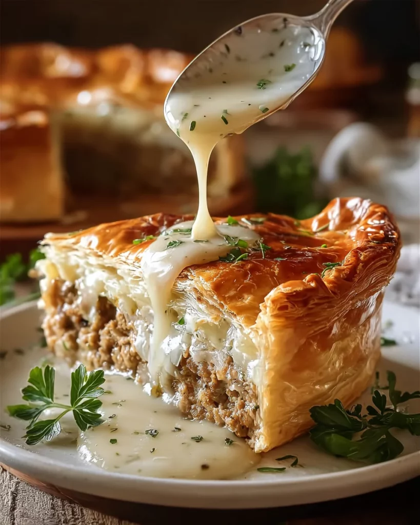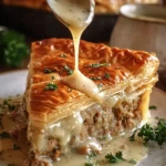 Sausage Gravy Puff Pie is a delightful comfort dish featuring a flaky pastry filled with savory sausage gravy, perfect for any meal.