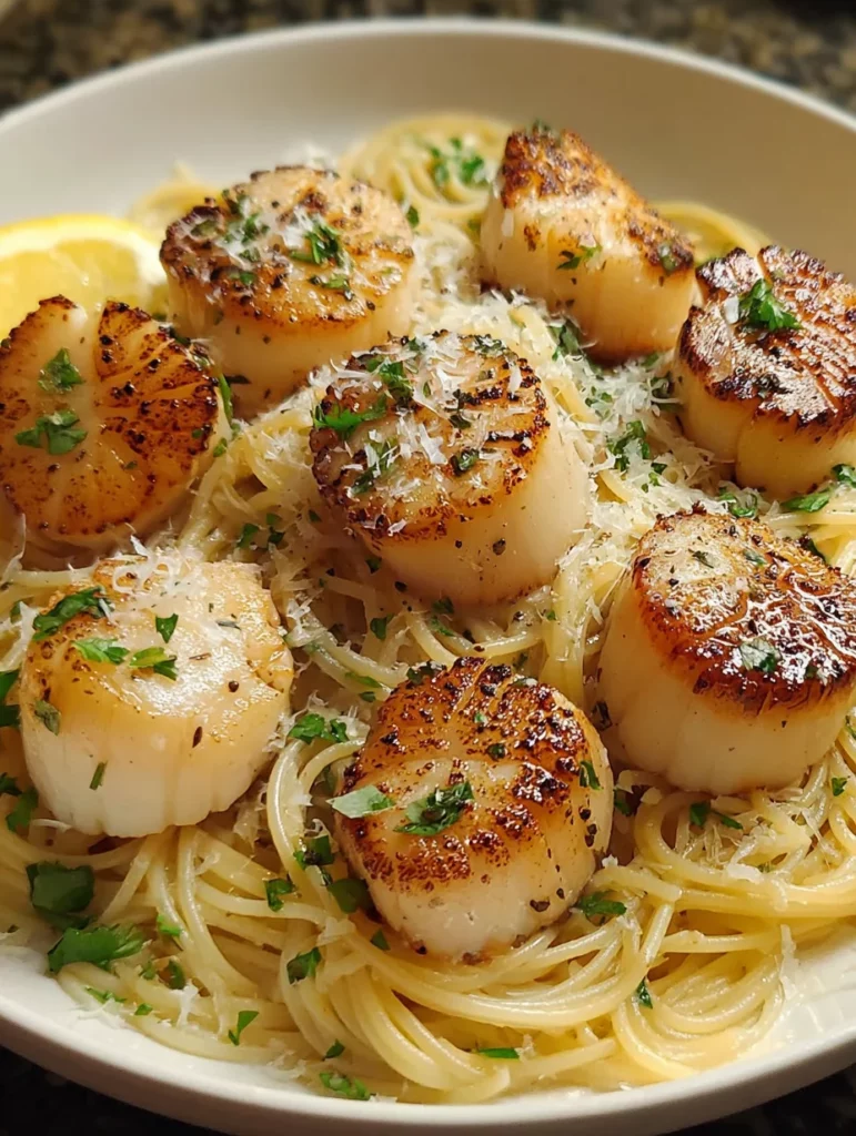 - Arrange scallops on top of the pasta. Sprinkle with fresh parsley and Parmesan cheese if desired. Serve immediately with extra lemon wedges.