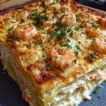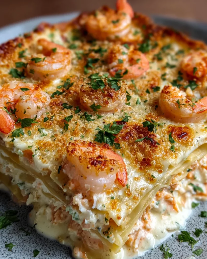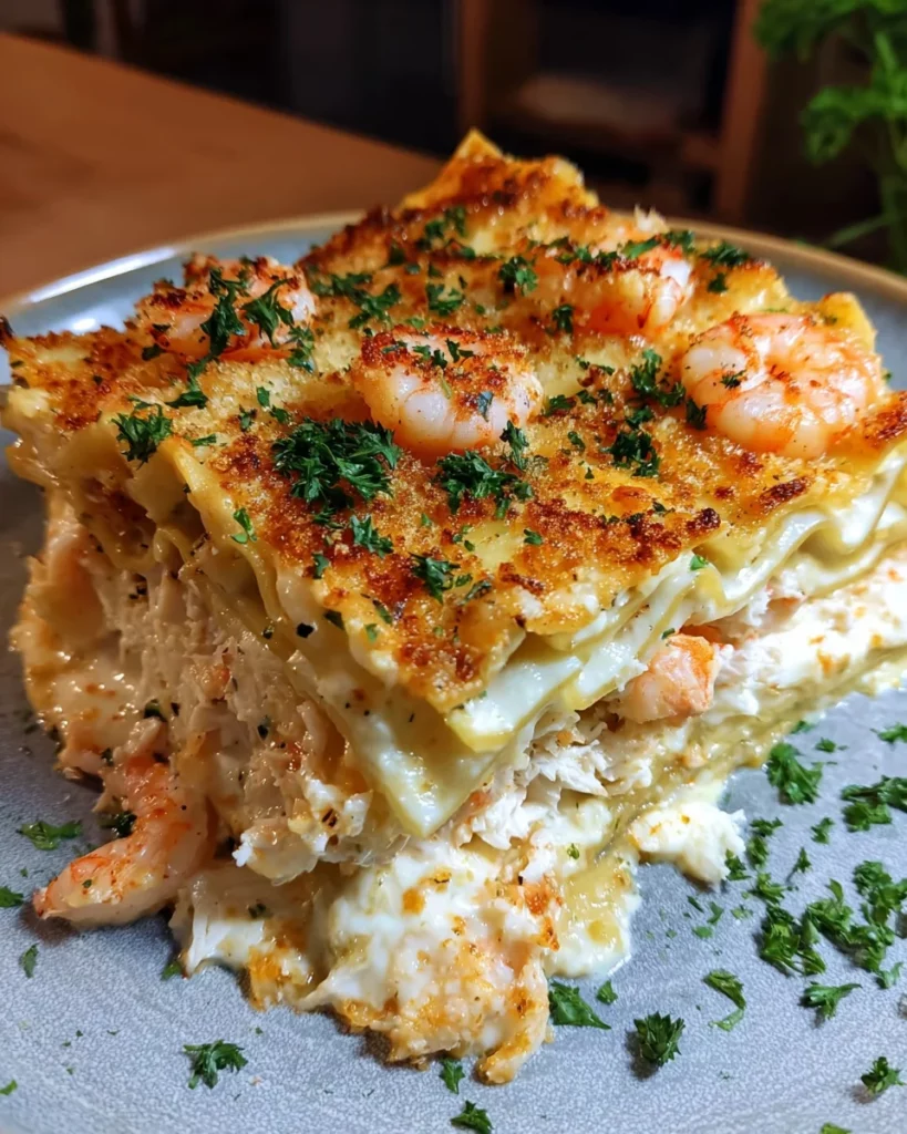 Seafood Lasagna Shrimp Crab is a delicious twist on traditional lasagna, featuring layers of shrimp, crab, and creamy cheeses.