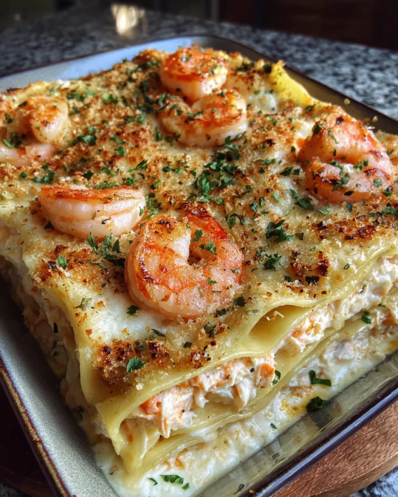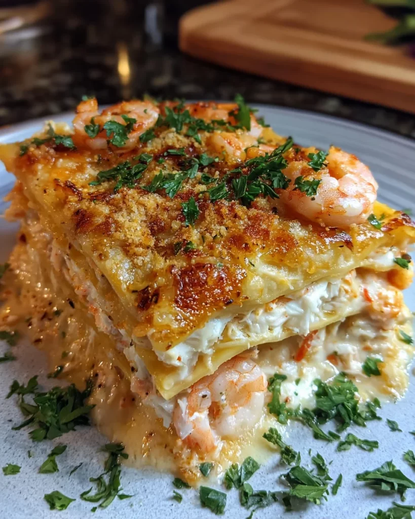 A delicious seafood lasagna featuring shrimp and crab, layered with rich cheeses and Alfredo sauce.