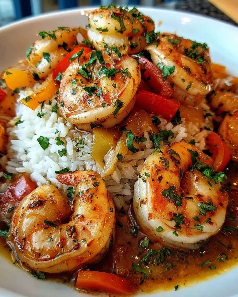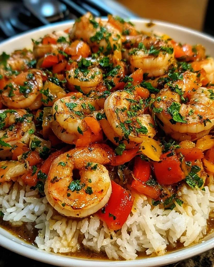 Now for the final touch! Serve the shrimp mixture generously over your cooked white rice. Make sure to spoon on plenty of the colorful vegetables and that delightful sauce. Watch how it transforms a simple bowl of rice into a feast! Sprinkle some freshly chopped parsley on top for a pop of color. Your Shrimp On Rice is now ready to be enjoyed!