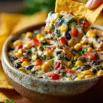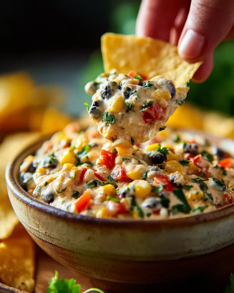 Now comes the fun part—let’s add the veggies! Toss in the drained corn, diced black olives, finely chopped red bell pepper, and if you’re brave, the optional green chilis or diced jalapeño for a touch of heat. Stir everything together with lots of love. You want the colors to blend and the flavors to marry perfectly. The crunch from the veggies paired with the creaminess of the dip makes every bite an experience!