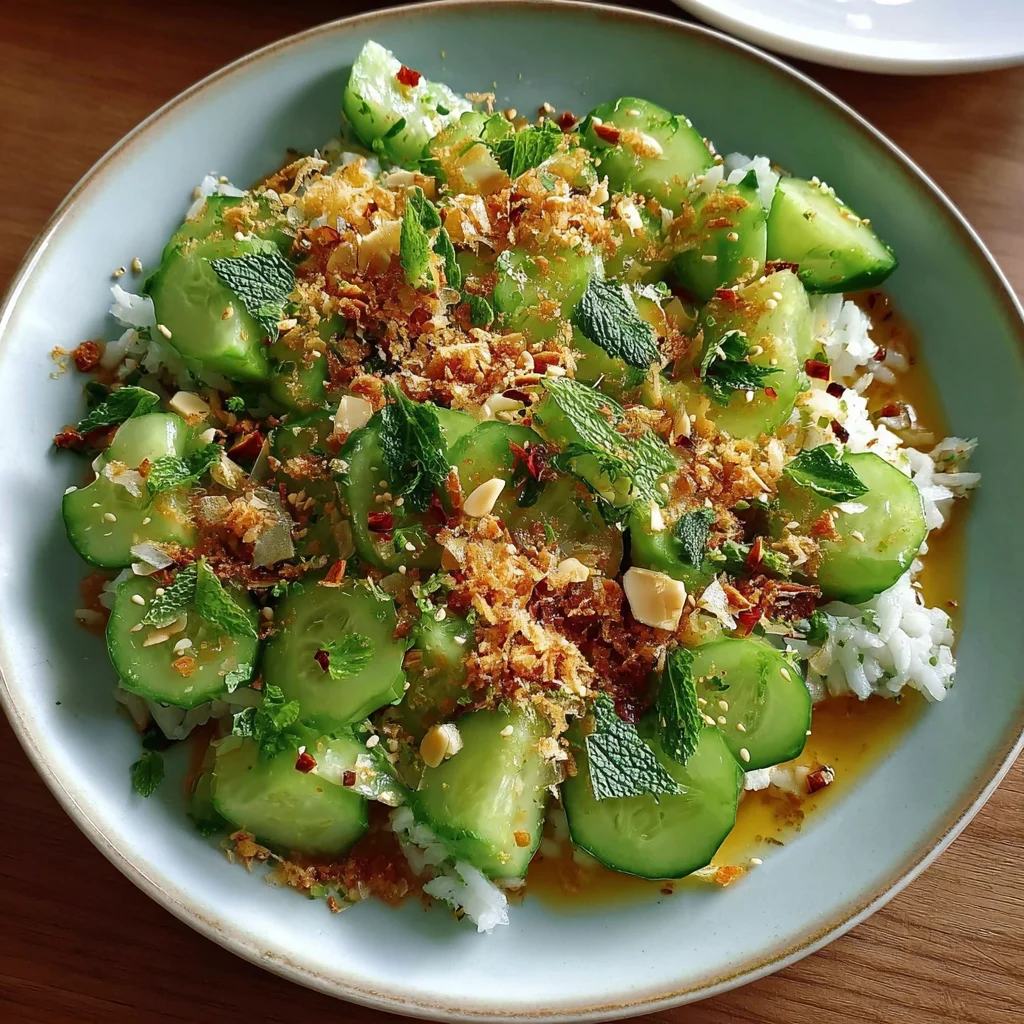 A refreshing cucumber salad mixed with rice, infused with a flavorful dressing.
