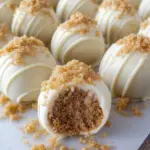 Delicious and creamy Snickerdoodle Cream Cheese Truffles coated in white chocolate and garnished with cookie crumbs.