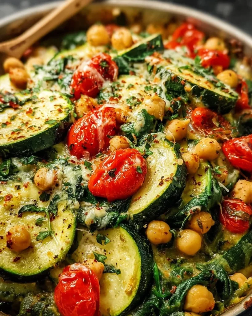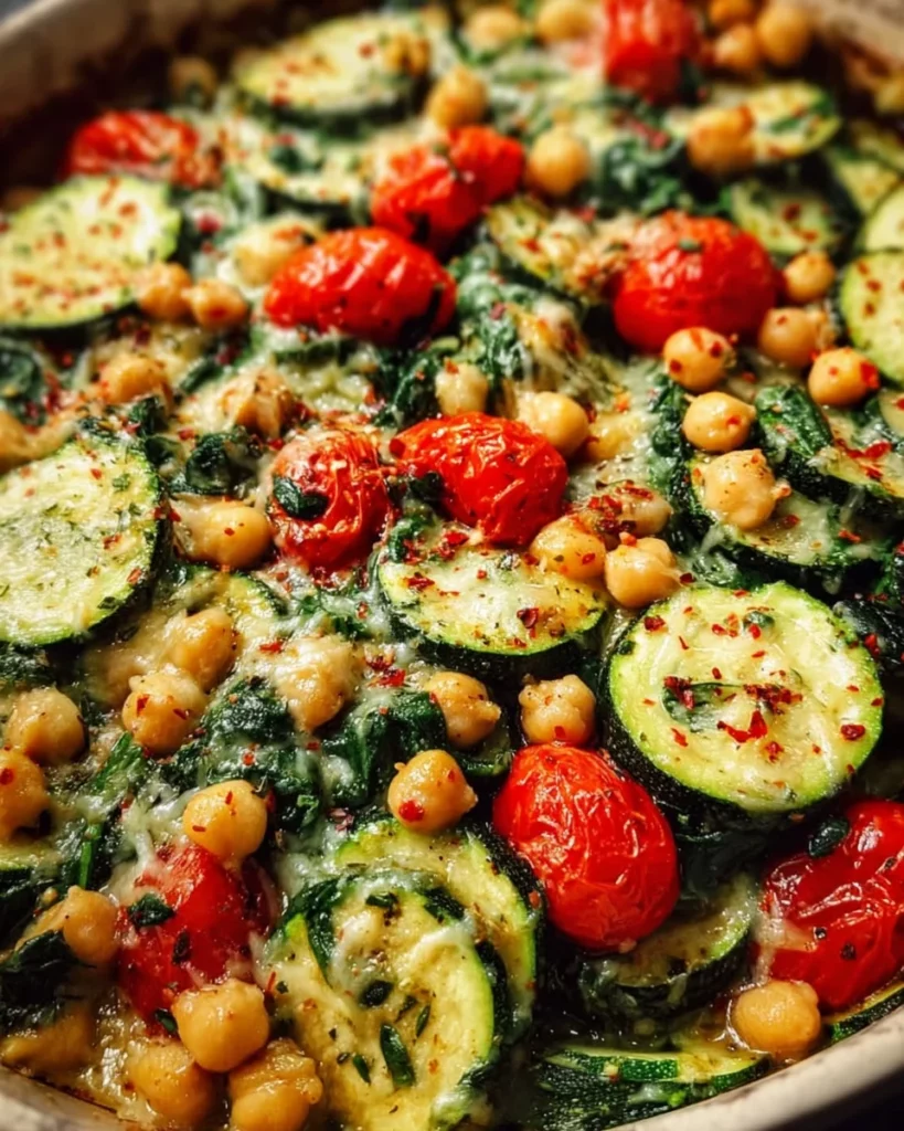 A healthy and delicious bake featuring zucchinis, chickpeas, and spinach, topped with melted cheese.