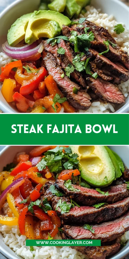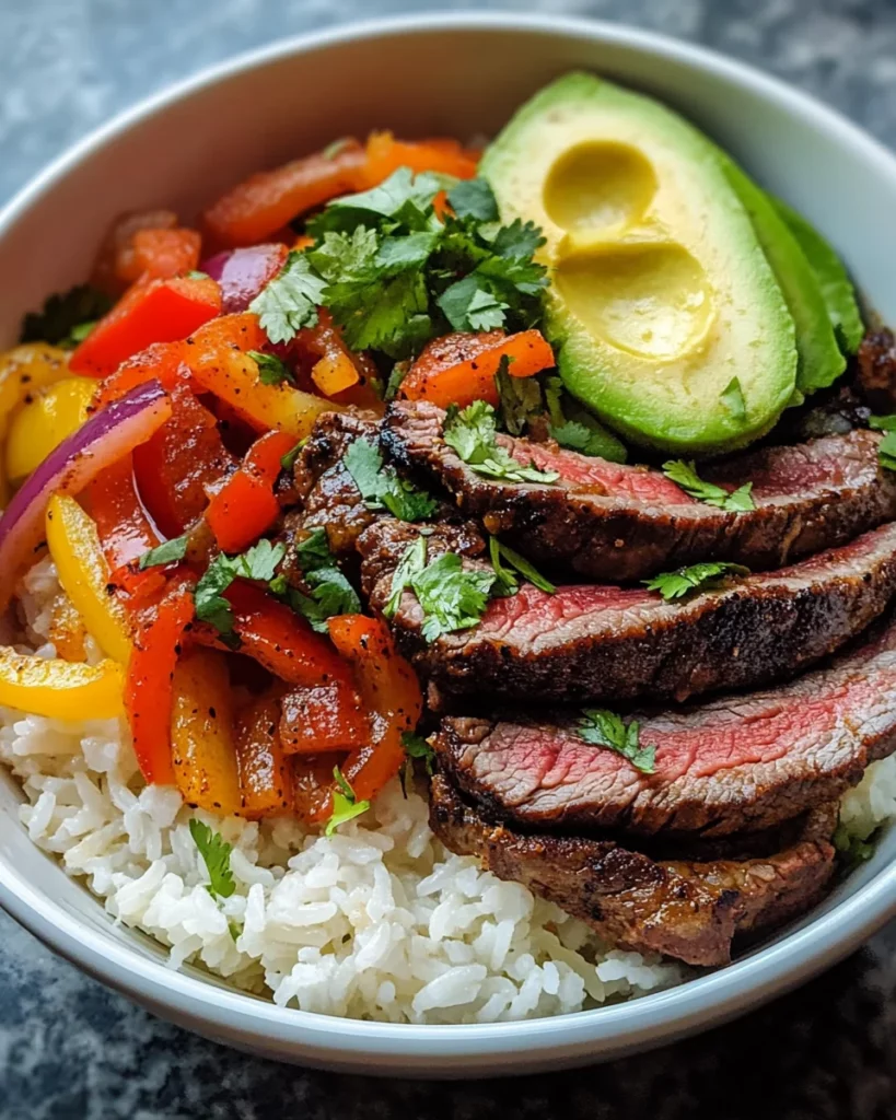 A delicious and easy-to-make Steak Fajita Bowl that combines tender steak with sautéed vegetables served over a bed of rice.