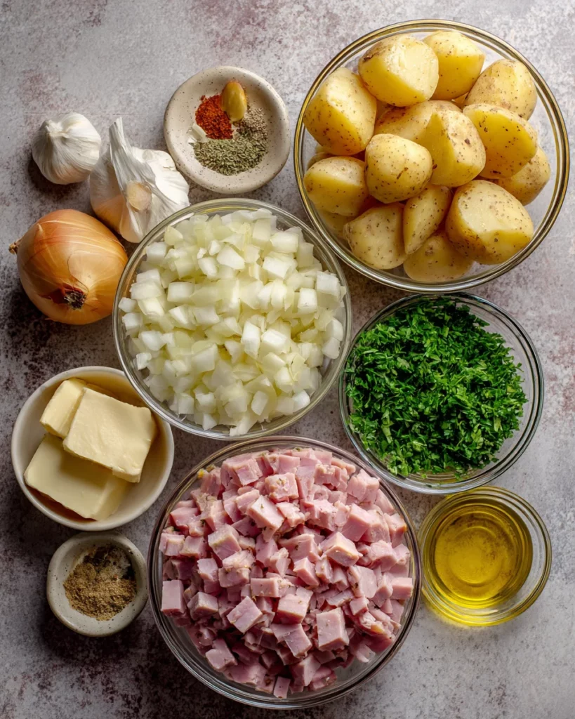 Gathering the right ingredients for your Stewed Potatoes with Ham is an enjoyable start to this flavorful dish. Here’s a list to help you prepare: