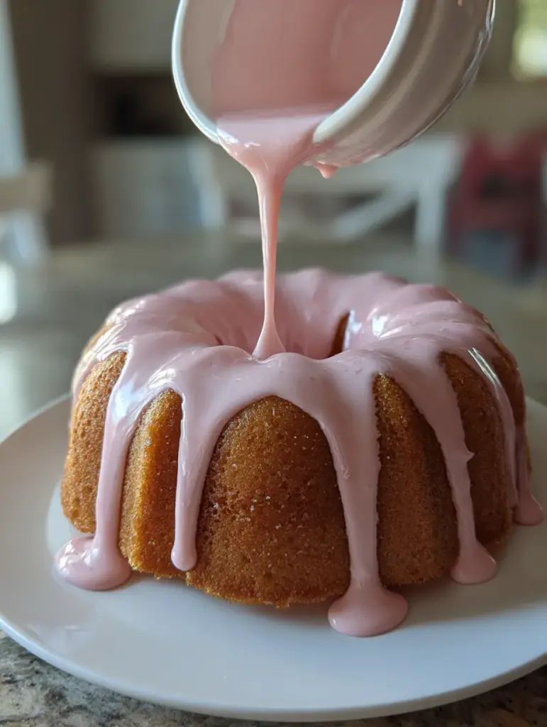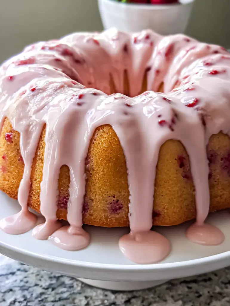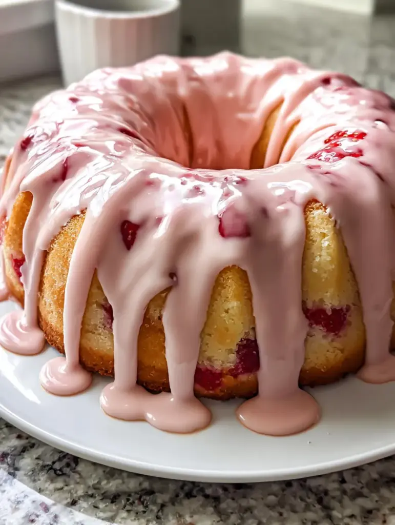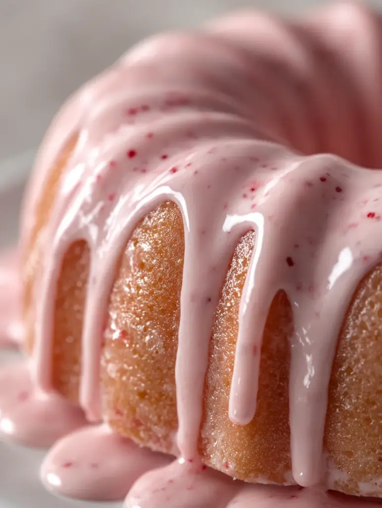 What really makes this cake special is how intentional every element is. Nothing is decorative for the sake of looks alone. The glaze isn’t just pink and pretty—it adds creaminess and extra strawberry flavor. The Bundt shape isn’t just classic—it helps the cake bake evenly and hold that glaze beautifully. Even the strawberry pieces are chopped small on purpose so every bite feels balanced.
