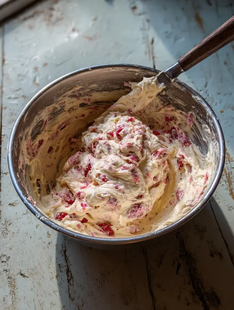 Unlike oil-based cakes, butter-based pound cakes rely on proper creaming. That means taking your time when beating the butter and cream cheese together. When done correctly, this step traps air inside the fat, creating a batter that bakes evenly and holds strawberries without collapsing.