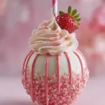 Your masterpiece is almost complete! Pipe a swirl of that luscious cheesecake whipped cream onto the top of each apple. Finish off with a fresh strawberry placed right on top and a sprinkle of pink sugar crystals or extra strawberry crunch for that wow factor.