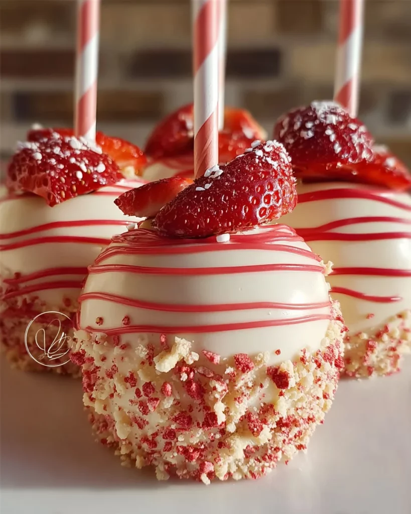 A sweet and delightful treat combining the flavors of strawberry shortcake with the fun of candy apples, perfect for gatherings or special occasions.