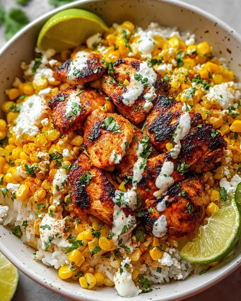 A delicious and vibrant Street Corn Chicken Bowl featuring grilled chicken, charred corn, creamy lime sauce, and fresh ingredients.