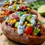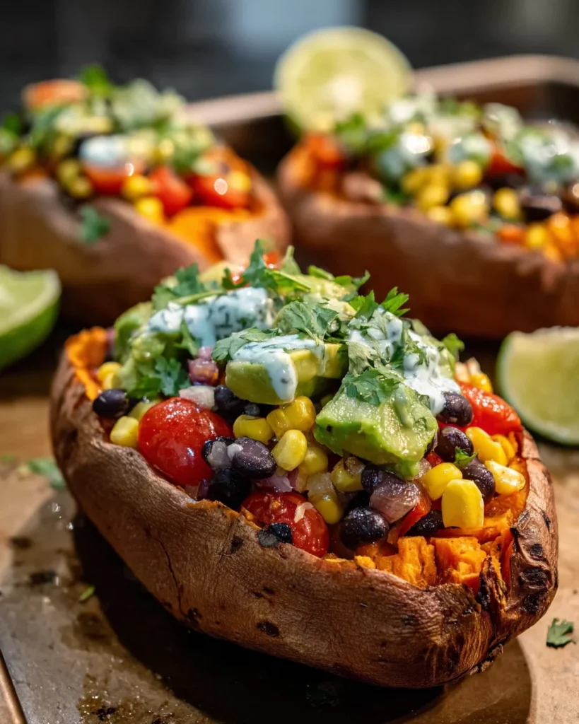 A nutritious and flavorful dish made with stuffed sweet potatoes filled with black beans, avocado, and topped with a zesty cilantro lime crema.