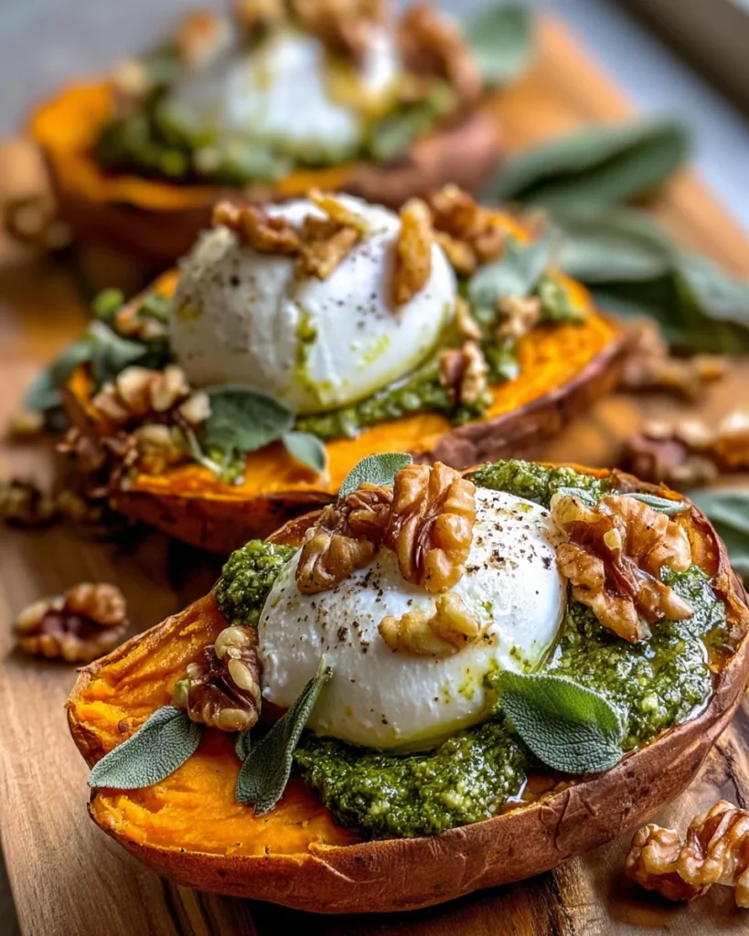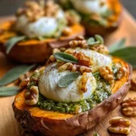 Cooking Stuffed Sweet Potatoes With Burrata, Toasted Walnuts & Sage Pesto is more than just preparing a meal; it’s about sharing love and care through food. Every bite invites you into a world of comforting flavors and wholesome goodness. Whether it’s a cozy family dinner or a gathering of friends, this dish sparks joy and conversation around the table. By creating this delightful recipe, you’re not just satisfying hunger; you’re crafting memories. So grab your apron, embrace the process, and let each stuffed sweet potato remind you that home-cooked meals are indeed a heartfelt celebration of life.