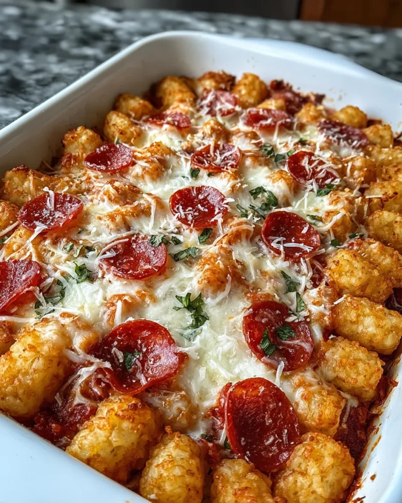 Tater Tot Pizza Bake is a fun and easy family dinner that combines the deliciousness of pizza with the crunch of tater tots.