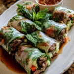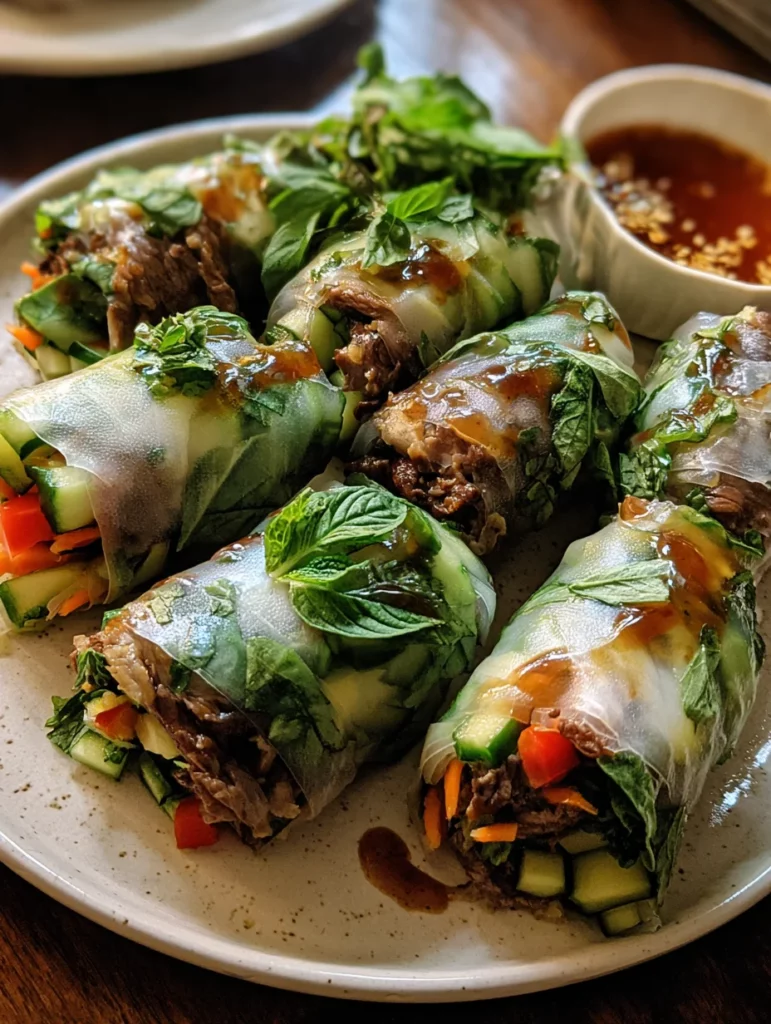 Thai Basil Beef Rolls are a flavor-packed delight, featuring seasoned ground beef wrapped in delicate rice paper, paired with fresh herbs and served with a spicy dipping sauce.
