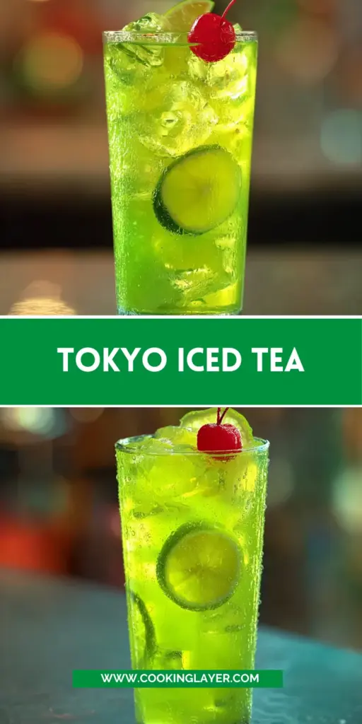 To finish off your stunning creation, add a splash of melon liqueur for a pop of color and flavor. Then, crown your cocktail with a vibrant cherry on top. This little burst of sweetness is the cherry on the, well, you know! Don’t forget to give your drink a gentle stir to mix everything nicely before you serve it. Now take a moment to admire your handiwork. Grab a straw, invite a friend, and enjoy this delightful Tokyo Iced Tea together!