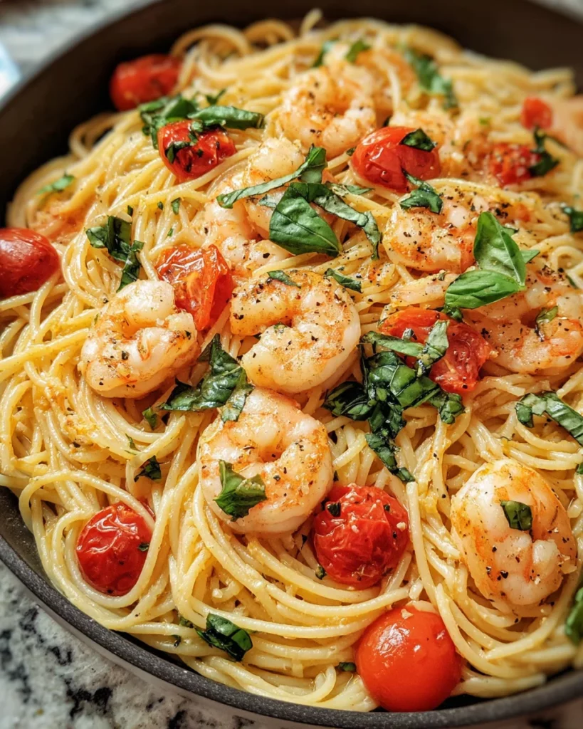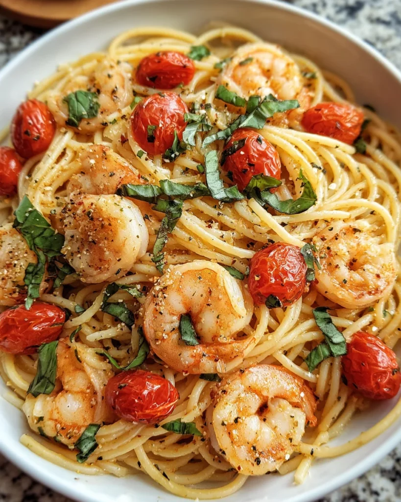 A delightful and flavorful pasta dish that combines shrimp, cherry tomatoes, and fresh basil for a delicious meal.