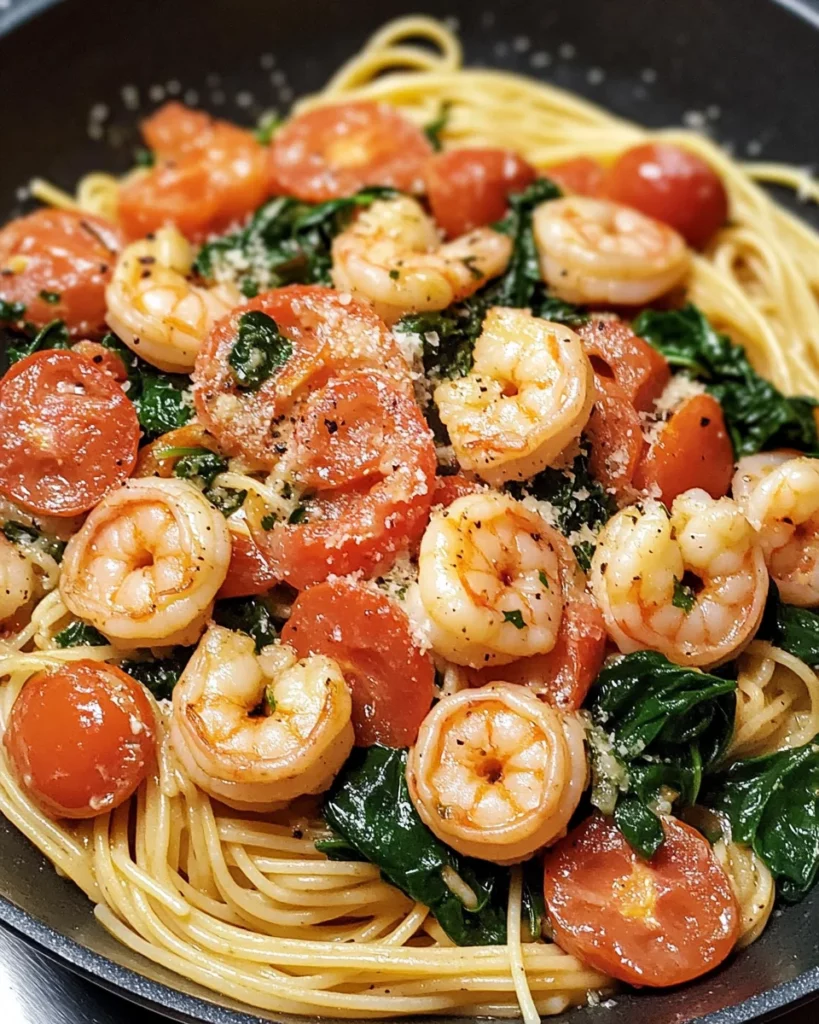 A quick and delicious pasta dish featuring shrimp, spinach, and tomatoes, perfect for a weeknight meal.