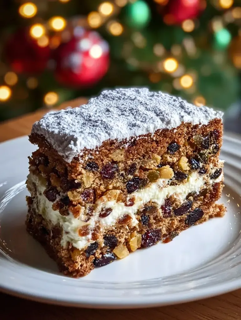 A great Christmas cake isn’t light and fluffy like a sponge—it’s dense, but not heavy; moist, but not soggy. That creamy filling you see in the image? That’s a slight modern twist on tradition. It adds a rich layer between the fruity goodness, creating both visual appeal and extra indulgence.
