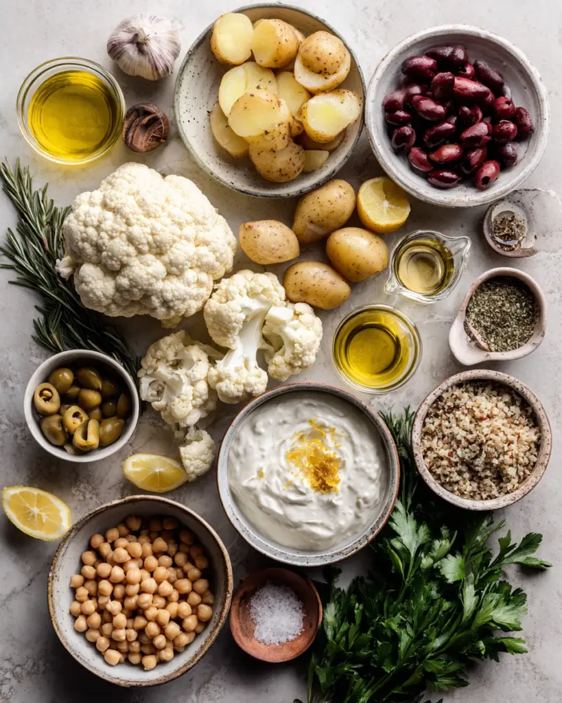 - Cut the cauliflower into florets and slice potatoes into even wedges. Drain and rinse chickpeas thoroughly. Combine cauliflower, potatoes, chickpeas, and pitted olives on a large baking sheet.