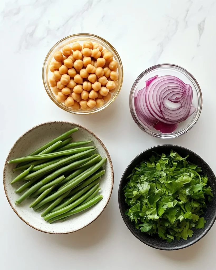 - In a large bowl, combine the green beans, kidney beans, chickpeas, red onion, and parsley.