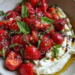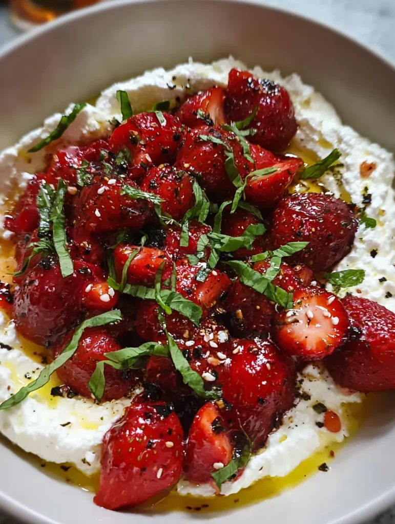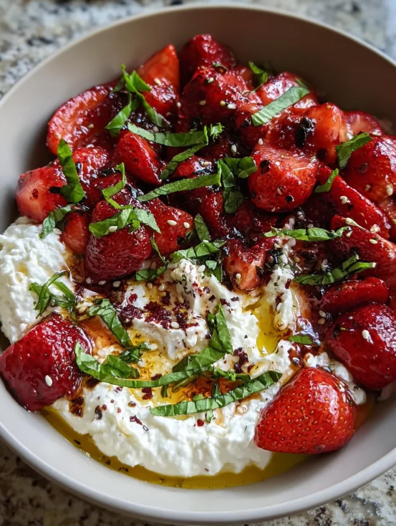 Now comes the fun part! Spread the creamy whipped feta onto a beautiful serving plate. You can create a lovely swirl using the back of a spoon. Then, generously spoon those roasted strawberries right on top, letting them cascade like a fruity waterfall. Drizzle with olive oil for that extra flair. Finally, don’t skimp on the garnish! Chopped fresh basil or mint adds a vibrant pop of color and flavor.