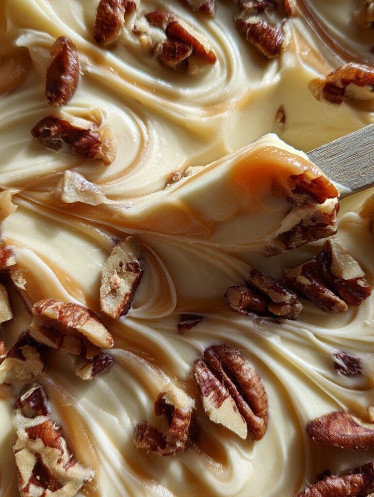 But here’s the kicker: once that creamy layer is set, we drizzle and swirl it with molten caramel and crunchy toasted pecans. You get the soft sweetness of white chocolate, the slightly salty, buttery bite of caramel, and the nutty crunch of pecans—all in one glorious bite.