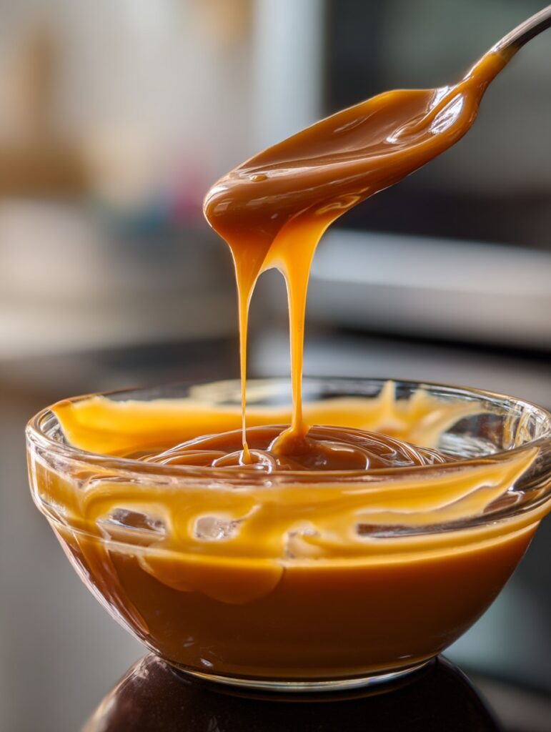 ⏱️ Duration: 1 minuteIn a microwave-safe bowl, melt caramel with heavy cream in short intervals until silky and pourable.