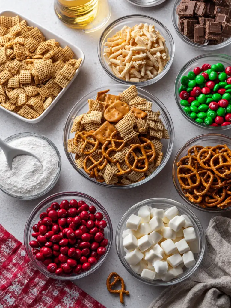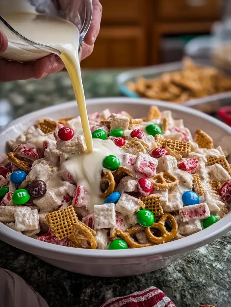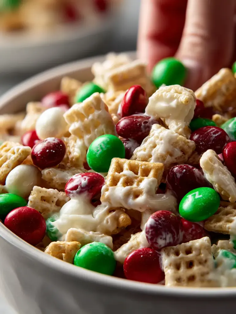 This mix hits that dreamy balance of texture and flavor. You’ve got the light crispiness of Chex cereal, the salty snap of pretzels, and the melty sweetness of white chocolate. Add in the bright pops of red and green M&M’s? It’s Christmas in a bowl.