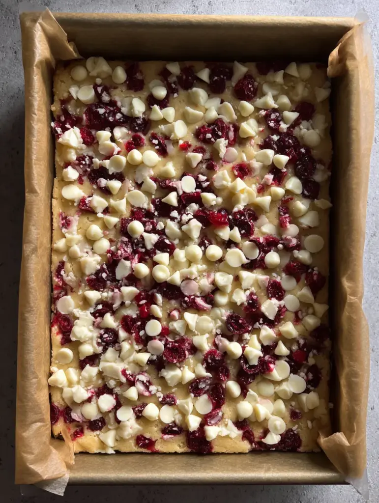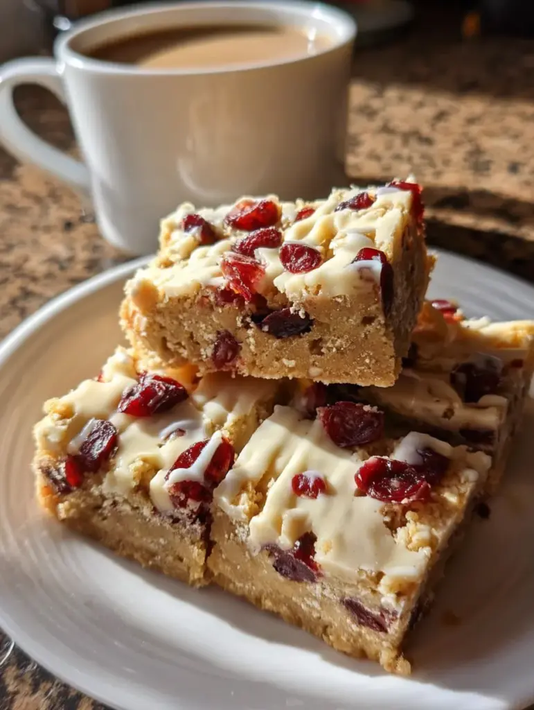 These bars aren’t just sweet treats—they’re a moment. Imagine this: You’re curled up under a fuzzy blanket with a cup of coffee, maybe snow gently falling outside, and you’re holding one of these soft, decadent squares. They’ve got a fudgy, slightly dense texture (hello, blondie perfection), with white chocolate melting in your mouth and cranberries giving that pop of tartness that balances out the sweet. It’s nostalgic. It’s festive. It’s irresistible.