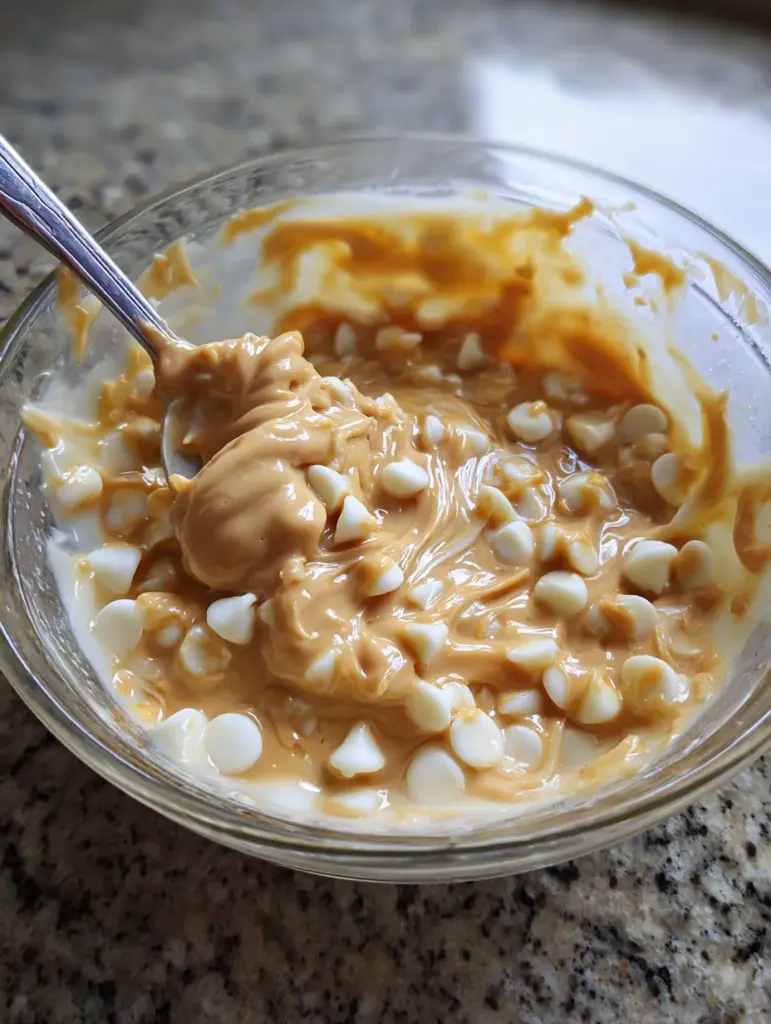 In a microwave-safe bowl, melt the white chocolate chips and creamy peanut butter in 30-second intervals, stirring each time until smooth. (⏱️ 1–2 minutes)