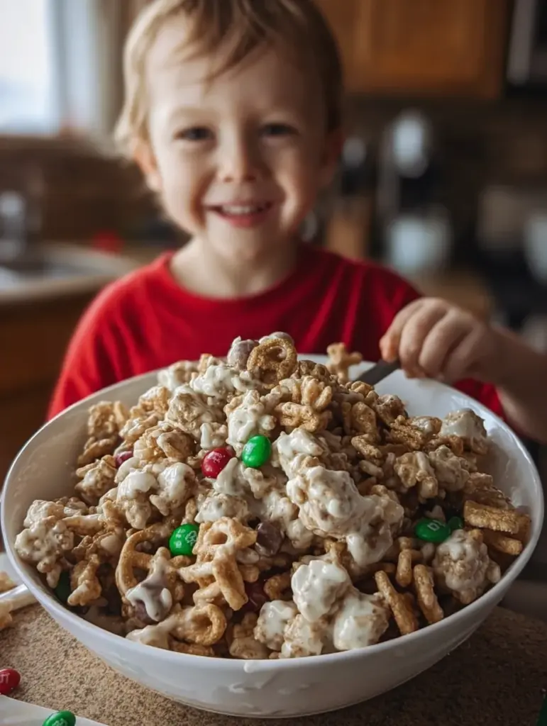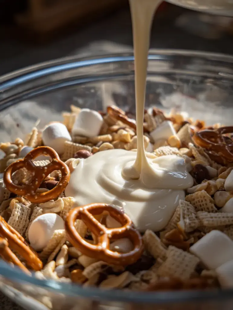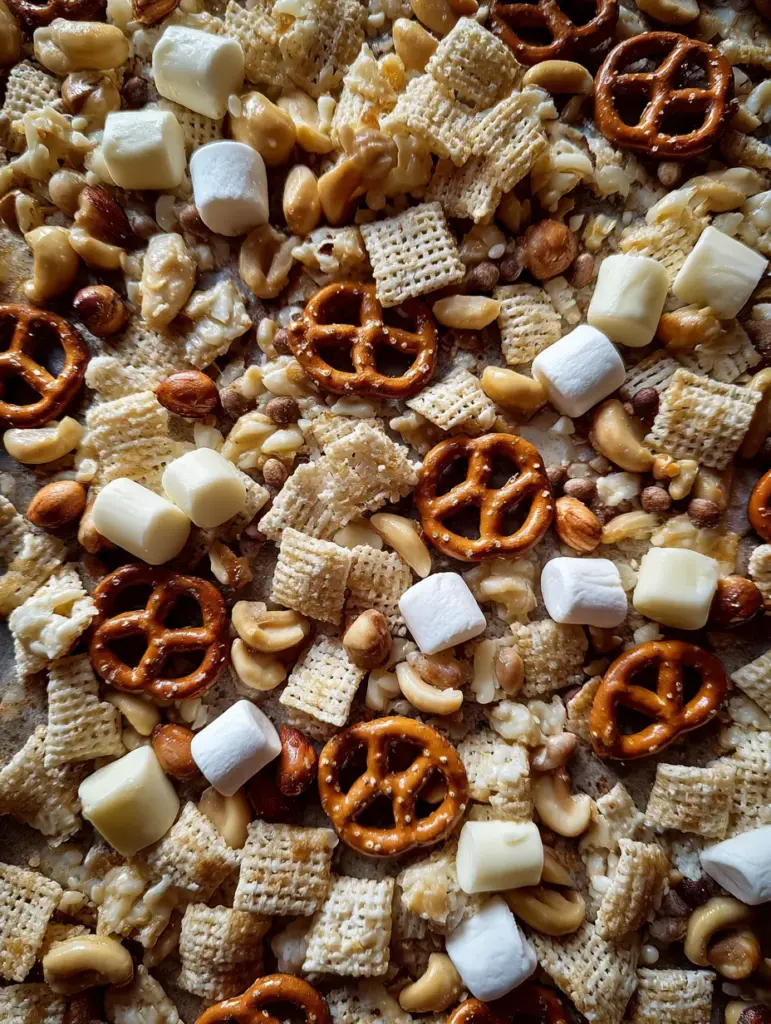 It’s typically a blend of cereal, pretzels, nuts, candies, and marshmallows all held together with a generous drizzle of melted white chocolate. Once it cools and hardens, it’s broken into chunky clusters of pure delight.