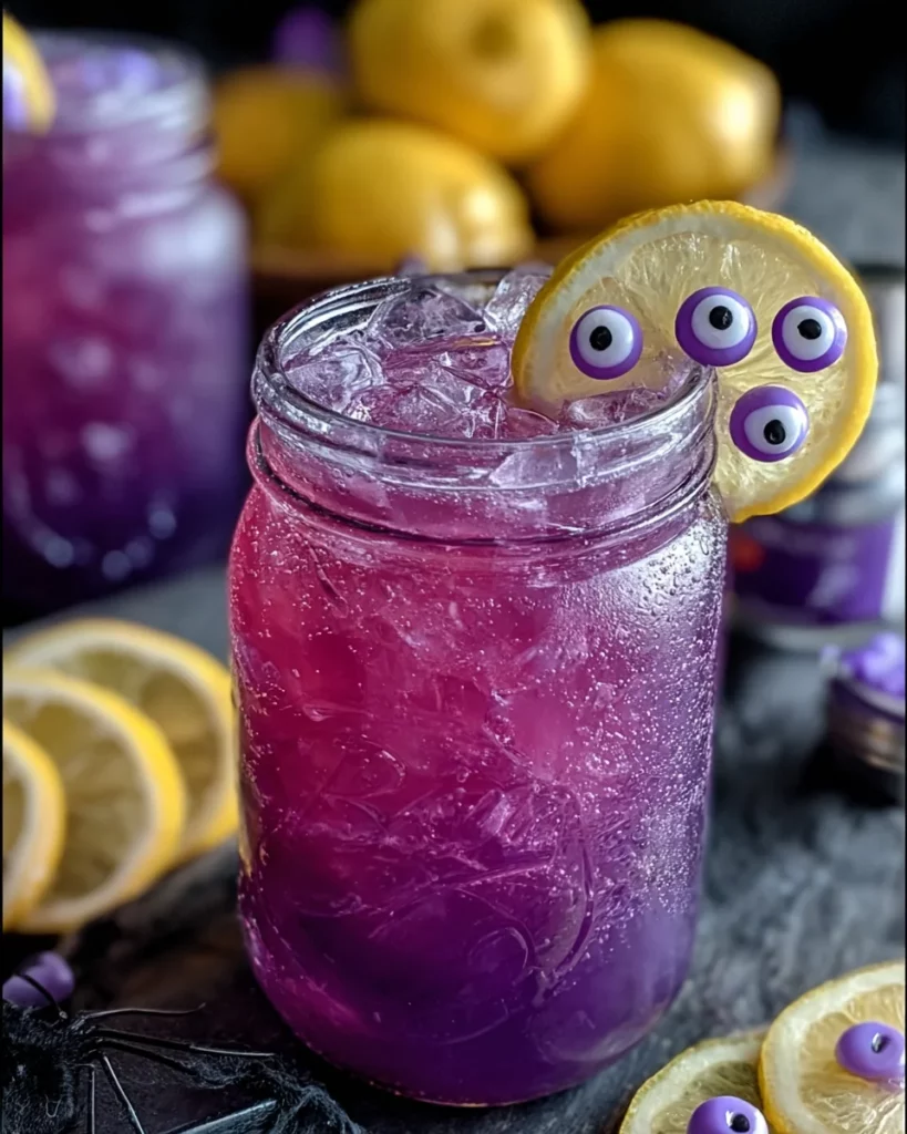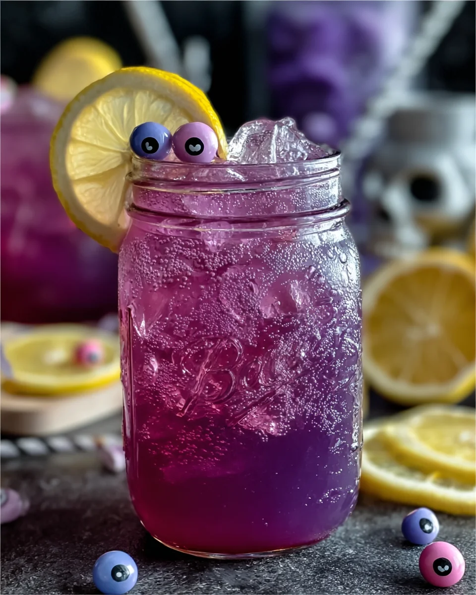 A spooky and vibrant Halloween drink that combines lemonade, grape juice, and fizzy soda for a fun festive experience.